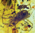 クモ類と思われる節足動物も確認できます。捕食者が含まれているという事実だけで、この琥珀が単なる偶然の集合ではないことが分かります。食う側と、食われる側。その距離感まで含めて、樹脂が封じ込めてしまったような印象です。