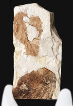 母岩の上には、二つの葉の化石が残されています。この化石が形成された当時、一帯は火山活動を伴う内陸の盆地で、豊かな湖や湿地が広がっていました 。水面に落ちた葉が、酸素の少ない湖底で静かに泥に覆われたことで、分解されることなく「実体」として現代に姿を現したのです。通常、葉の化石は痕跡だけにとどまることが多い中、本標本では一部が炭化し、葉そのものが黒く残存しています。希少性の高い、実体保存の木の葉化石です。