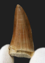 比較的多く歯の化石が出回っているが、偽造品(母岩に歯を埋め込んだものが多い)も出回っているため注意が必要です。また、出土・保存状態によって品質はさまざまです。表面がエナメル質を保ち、かつルート(根元)が太いモササウルスの歯化石は意外に数が少なく価値が高いと言われています。
