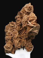 薄い板状のジプサム結晶が幾重にも重なっているのが分かります。モース硬度2という繊細な性質を持ち、爪で傷がつくほど柔らかい鉱物です。砂漠の砂を内包することで、この独特の褐色を呈します。表面を触ると、ザラザラとした感触です。