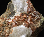 こちらは岐阜県神岡鉱山で産出された閃亜鉛鉱です。ギリシャ語の「欺く(sphaleros)」が名前の由来で、かつて銀や鉛を含む方鉛鉱と見間違えられ、鉱山師を泣かせた歴史があります。神岡特有の赤褐色から黒色の結晶が、白い母岩の上に群生しています。