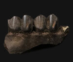 こちらは米国フロリダ州で発見された、新生代第四紀更新世のシカ科の顎骨付き歯化石です。歯と下顎骨がまとまって残されており、保存状態も良好です。フロリダ産標本らしい深い黒色が美しく、実物は写真以上に艶やかな質感をお楽しみいただけます。