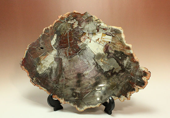 珪化木とは木の化石です。コレクション品として完成させる場合には、このように、年輪に対して平行にカットし、その模様を楽しめるようにします。このように大きな標本はある程度厚みが必要になります。本標本は2cmの厚みがあり、非常にどっしりとして高級感があります。