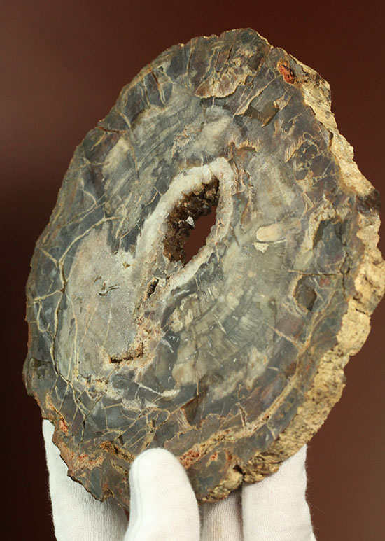 本標本は樹木の幹を輪切りにして円板状にしたものです。石化している木化石は、カチコチで、ご覧のように均一にカットされています。1本の幹を横にカットしてあるので、側面はぐるりと樹皮で覆われています。