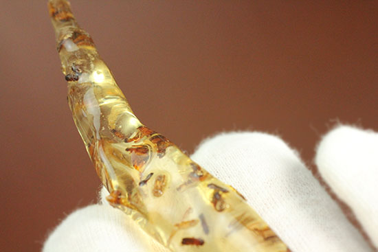 琥珀は、樹の樹脂が固まって化石化したものです。しばしば、琥珀の中から、昆虫や植物が見つかるのは、樹脂が土の上に流れ落ちる際に、虫やその他の生き物たちが一緒に取り込まれてそのまま化石となるからです。琥珀の中に内包された虫たちは、非常によい状態で保存されるので、触覚や羽などが生きた当時のまま見ることができるものもあります。昆虫や植物が入った琥珀は、まさにその時代の環境が内包されたタイムカプセルのようなもので、「虫入り琥珀」と呼ばれています。虫入り琥珀は世界中のコレクターからも人気が高く、かなりの高値で取引されます。