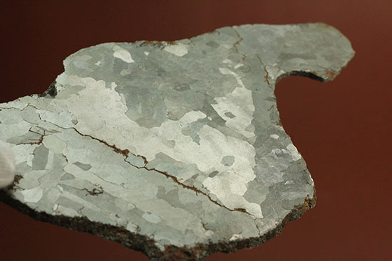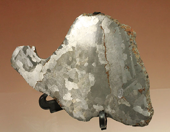 鉄隕石は一般的に、鉄分の少ない石質隕石と比較すると、風化が少なく状態の良いものが多いとされています。本標本も、クラックにわずかなさびが見られるだけであり、全体的に美しい金属光沢を持っています。