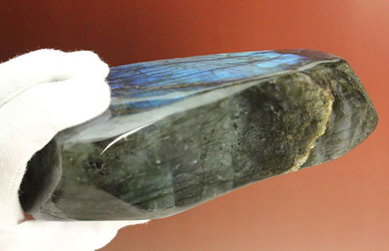 このビッグで大迫力の標本はラブラドライト(Labradorite)といい、日本名は曹灰長石(そうかいちょうせき)と呼ばれています。本品はマダガスカル産。これほどの固まりで強くフラッシュするものは化石セブンで初めてです。