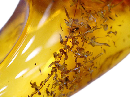 琥珀は「タイムカプセル化石」といわれるように、当時の森の様子を内包しています。透明度の高い本標本のような琥珀では、中が透き通って見えるので中に包まれた虫や植物片などが容易に見つけることができます。