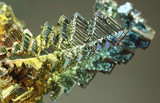 上の写真では、さまざまな色を呈していますが、ビスマスの本来のいろは、銀白色です。写真の色は、結晶化の過程で、表面が酸化し膜ができたことに因ります(薄膜干渉)。