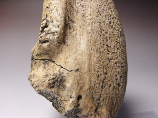 ティラノサウルスの歯は非常に太く長いのが特徴です。他の獣脚類に比べてもその特徴は明確で、切り裂くというよりは噛み砕くのに適していました。歯根(歯額の中に埋まっている部分)も非常に長かったという事実がよりこの特性を裏付けています。歯茎より上、つまり見えている部分が7-8cmにも関わらず、歯茎に埋まっている部分が22-23cmという化石が実際に発見されています。
