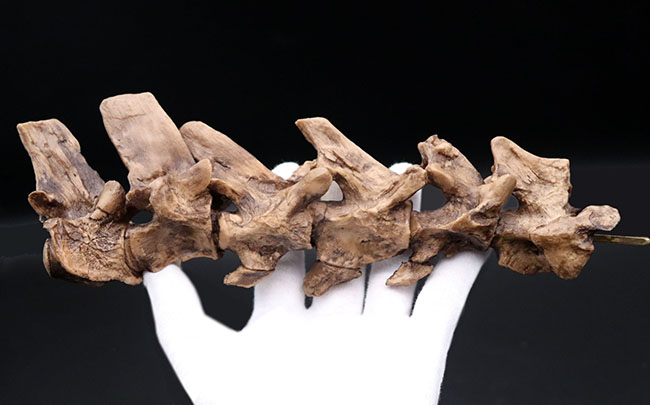 比較的多く歯の化石が出回っているが、偽造品(母岩に歯を埋め込んだものが多い)も出回っているため注意が必要です。また、出土・保存状態によって品質はさまざまです。表面がエナメル質を保ち、かつルート(根元)が太いモササウルスの歯化石は意外に数が少なく価値が高いと言われています。