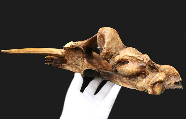 体長2メートルでライオン並だが、牙が25センチもあり、口が120度も開くので非常に深く突き刺すことができた。使い方は、