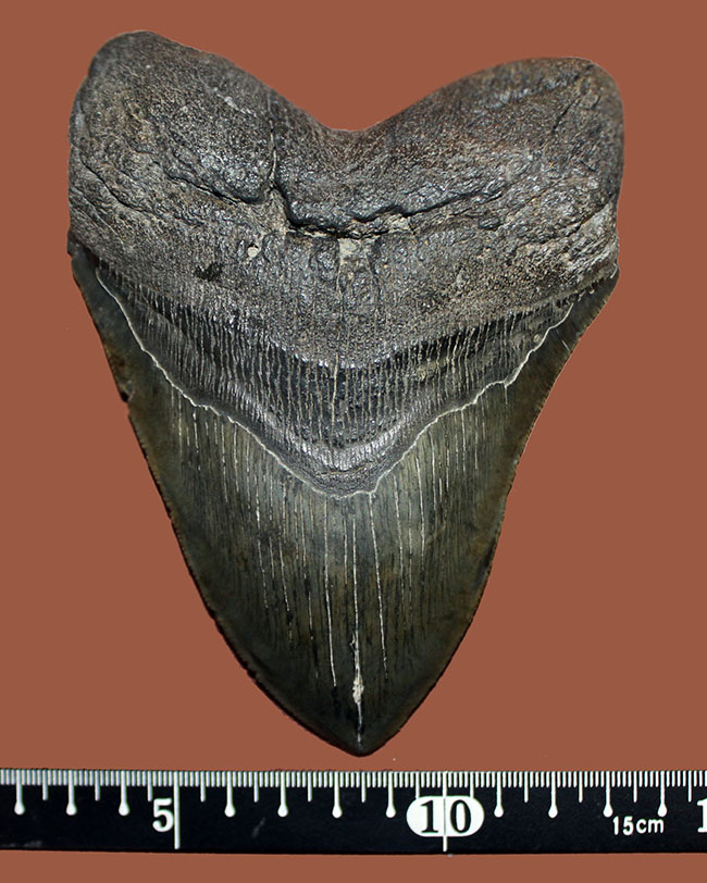 - 長い方のカーブに沿って15センチという、メガロドン(Carcharodon megalodon)の歯化石のなかでも特大と申し上げて良い、立派な標本