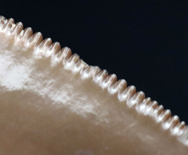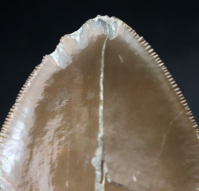 先端のみですが、非常に美しいエナメル質とセレーションがほぼ完全に保存されています。