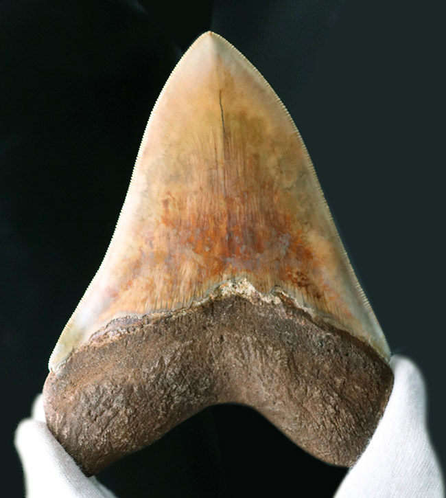 長い方の辺に沿って14センチ。メガロドンの名にふさわしい大きな歯化石です。
