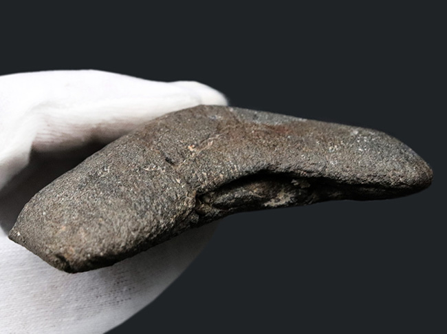反対側の面も甲乙つけがたい抜群の保存状態であります。堆積時には粘土質の流砂によって化粧され、陶器のようなきめ細かい表面。上質のメガロドンの歯化石に共通の特徴の一つ。詳しくはコラム「化石の色はどのように決まるのか。メガロドン歯化石から探る。」を御覧ください。