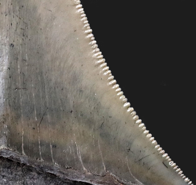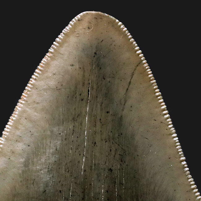 そんな中、非常に美しい標本をご紹介できます。セレーション(ギザギザの部分)とエナメル質のいずれも極めて上質な保存状態を維持している逸品であります。