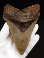 100円玉との比較です。紛れもない巨大歯でありながら、スマート&シャープなフォルムが美しい標本です。チリという極めて希少な産地もさることながら、何より、歯冠の非常に美しいナチュラルな色合いと質感が、所有欲を一層かき立てます。メガロドンのヘビーコレクターが思わず唸る、まさにコレクティブアイテムと言える逸品です。