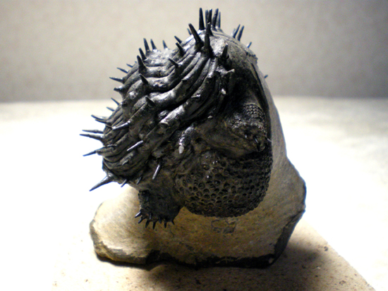 三葉虫は敵から身を守るために体を丸めて防御していました。ちょうど現生のダンゴムシのような格好です。他には、砂から眼だけを出して様子を伺ったり、毒を出すものもいました。魚類が出現してからは、全身に鋭いトゲをもつものまで現れました。