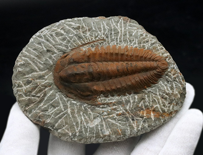 こちらの個体は同種の個体のなかでも、立体感を残しており、明らかに保存状態が優れています。頭部の左右にある失われやすい自由頬が完全に保存されています。