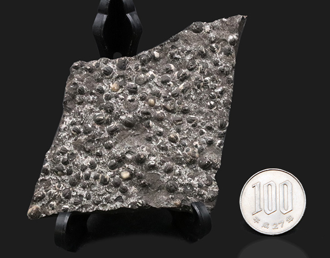 100円玉との比較。極めて初期の三葉虫、アグノスタス・ピシフォルミスの群集化石です。