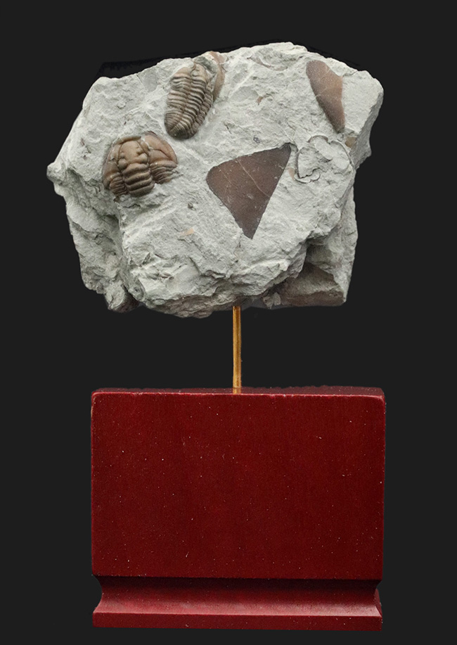 今回はフレキシカリメネの群集化石を購入しました。イソテルス・マキスムステルスの部分化石も確認出来るため、お得な化石でした。化石は木製の台座に金属棒で固定されてそのまま飾れます。自分で化石に穴を開ける勇気はありませんが、こんな方法があったのかと思える標本です。