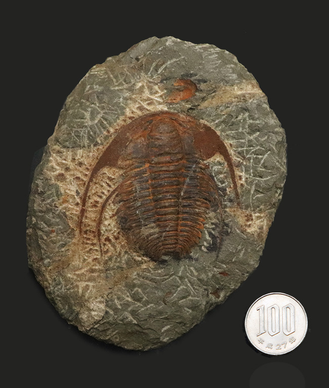 100円玉との比較。最も古い三葉虫の一つ、プリコパリア目に属する、ルサティオプスの化石です。
