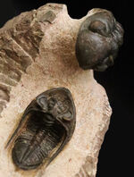 こちらは、モロッコ南部アンチ・アトラス山脈のアルニフ近郊、デボン紀の地層から採集されたズリコバスピス・ルゴーサ(Zlichovaspis rugosa)とリードプス(Reedops)のダブル標本です。写真左下の長い頬棘をもつ三葉虫がズリコバスピスで、右上の大きな頭鞍部を備えた三葉虫がリードプスです。いずれも極めて上質で、特徴がよく現れています。こうして同時に保存された標本は希少です。