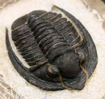 側面から撮影した一枚です。先ほど立体保存と述べましたが、ご覧のように中央軸が大きく盛り上がり、デボン紀三葉虫らしい迫力とボリュームを備えています。