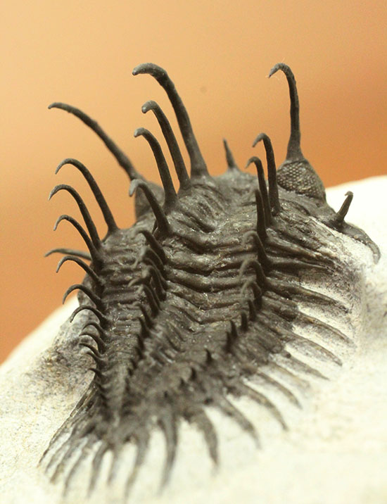 この異様に長い棘。その棘は真上に伸びています。三葉虫種類多しといえど、このような棘を持った種はコラムだけでしょう。まるでトサカのようです。