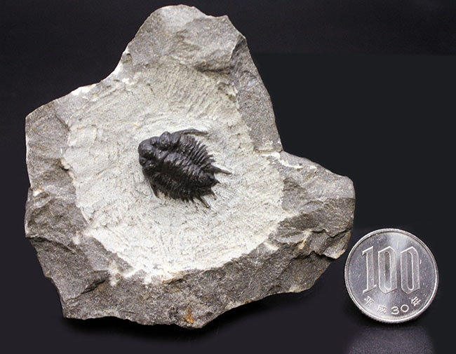 100円玉とほぼ同サイズの化石標本です。レアなリカス目の三葉虫、ロボピゲです。