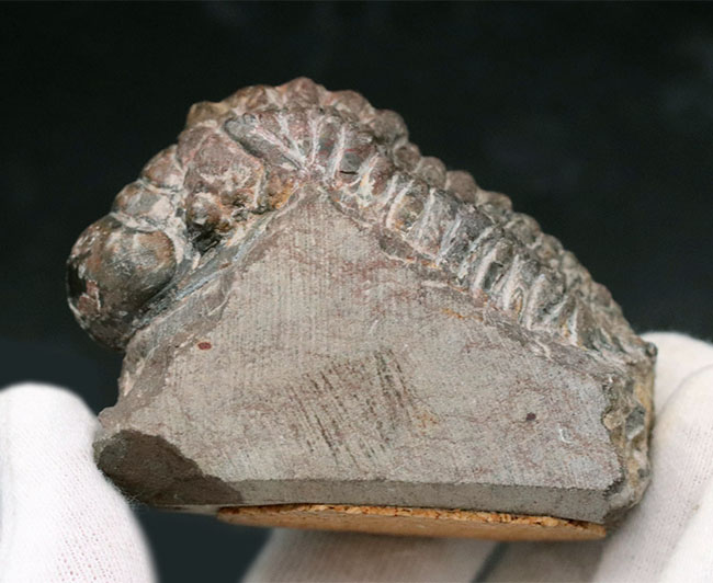 面白いポーズです。クロタロセファルスは、直線的なポーズをとった個体が多いですが、こちらの標本はやや珍しい。母岩の下にはコルクが貼り付けられていて展示の際に安定します。