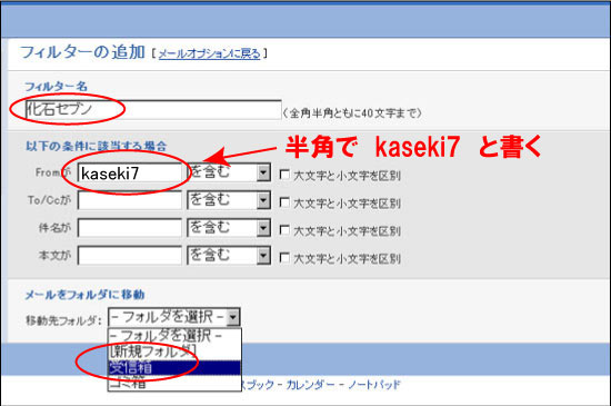 ④「フィルター名」に、化石セブンと書く。「From」に半角で kaseki7 と書く。「移動先フォルダ」を受信箱にする。最後に「保存」ボタンを押す。これで完了です。