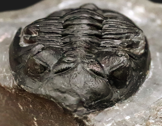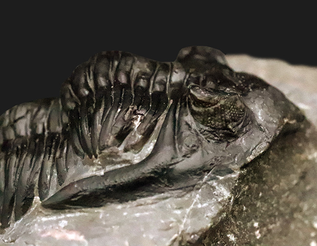 こちらは、本標本の見どころの一つ、複眼です。ファコプス類特有の独立した方解石レンズが、明瞭に観察できます。コラム”三葉虫と複眼……5億年前に完成していた「見る」という技術”も合わせてご覧ください。