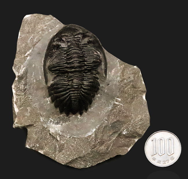 100円硬貨との比較写真です。モロッコ・デボン紀層から採集された、人気三葉虫の一つ、ホラルドプスの化石です。