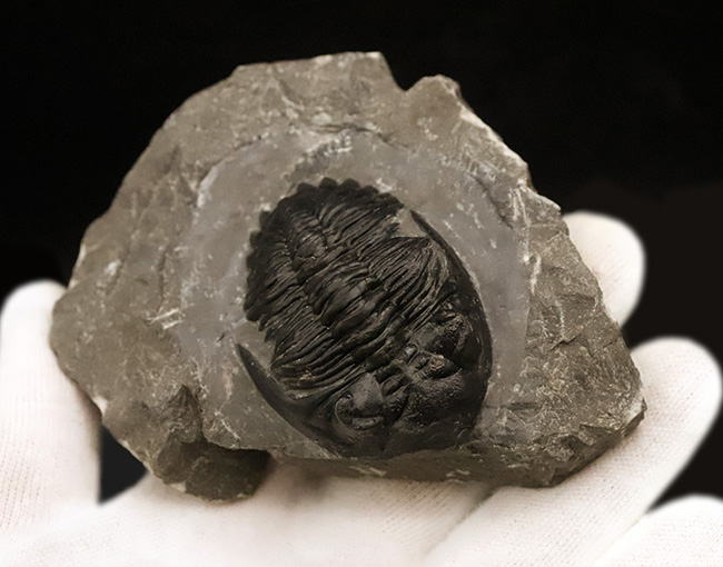 本標本は、デボン紀前期〜中期にかけて繁栄したファコプス目三葉虫、ホラルドプス(Hollardops)の良質な一例です。現代のモロッコにあたる北ゴンドワナ沿岸域に生息していたとされ、堆積物の多い浅海底で活動していた底生性の三葉虫と考えられています。
