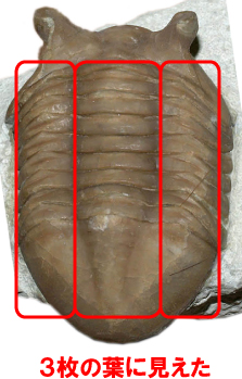三葉虫はトリロバイト(trilobite)と言います。triは「三」を、lobeは「葉」を、iteは「石」を意味しています。真上から見て縦に三つに割ると葉っぱが3枚ならんでいるように見えたということです。