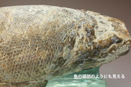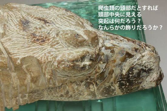 - もともとは丸いノジュールであった。つまり、水の中で堆積した可能性が高い?水性の生物であったか、死後、水の中に埋まっていたか