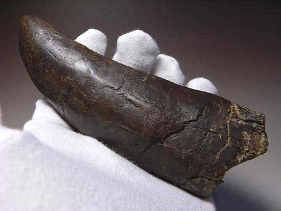 歯茎から外に出ている部分だけでも、ロングカーブ計測で14cm、根元の断面はほぼ円の形をしています。 それでいて、歯の稜線には鋭いセレーション(ギザギザの部分)を備えていることがお分かりいただけることでしょう。