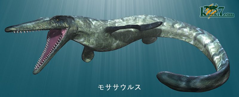 約7,900万年前の海生爬虫類で、体長16m、体重17t。肉食の海生爬虫類では最大の巨体を持っています。流れの強い海での生活に適応するため四肢はヒレに近く、現代のイルカやサメのように長い尾を持った姿であったと考えられています。