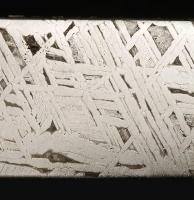 酸エッチングは、ウィドマンシュテッテン構造を視覚的に浮かび上がらせる処理方法です。鉄隕石を切断・研磨した後、酸で表面を処理すると、鉄が主成分のカマサイト部分が酸に反応しやすく、黒っぽく見えます。一方、ニッケルを多く含むテーナイト部分は酸の影響を受けにくく、明るい銀白色を保ちます。この違いにより、テーナイトとカマサイトの境界が明確になり、美しいウィドマンシュテッテン模様が浮き上がります。